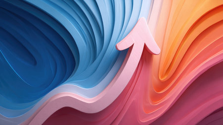 This abstract illustration features a dynamic wave pattern with an upward arrow, symbolizing growth and progress in vibrant shades of blue, pink, and orange.