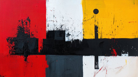 This captivating abstract expression artwork features a bold interplay of red, black, white, and yellow, creating an eye-catching visual experience with textured brush strokes.