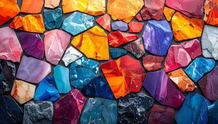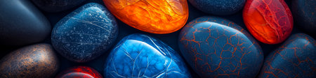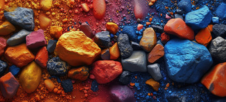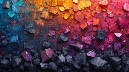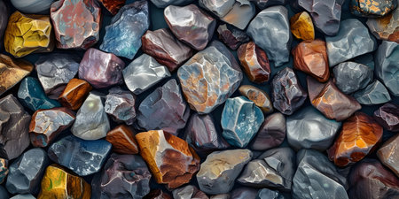 A collection of colorful rocks with a variety of textures and patterns. The rocks are arranged in a way that creates a visually interesting and dynamic composition. Scene is one of natural beauty
