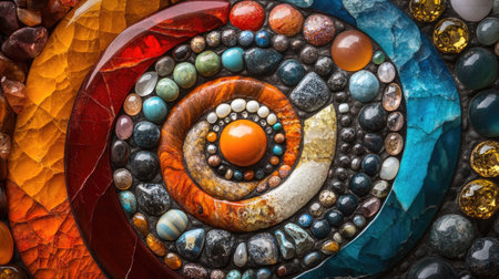 A stunning array of natural stones and crystals arranged in a captivating spiral pattern, showcasing vivid colors and unique textures for decoration.