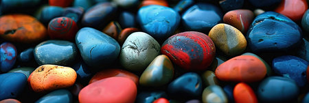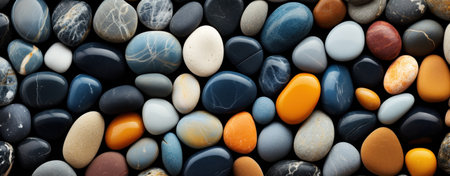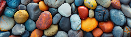 A Panoramic view of smooth, colorful pebbles forming a vibrant and textured background.