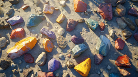 Vibrant painted rocks scattered across sandy terrain create a unique and artistic outdoor scene, showcasing a blend of color and texture under sunlight.