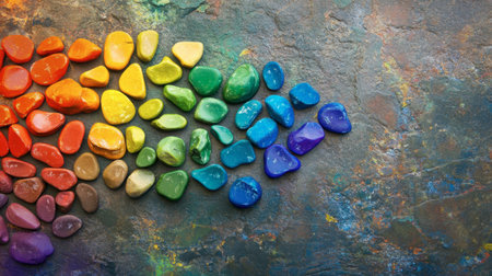 A stunning display of colorful pebbles arranged in a rainbow pattern against a textured surface. This artistic composition evokes feelings of harmony and joy, perfect for creative projects.