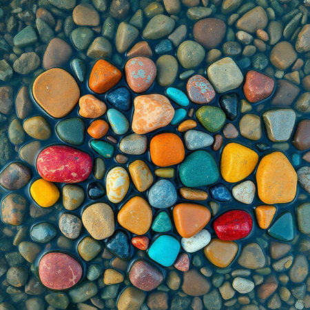 A beautiful collection of colorful underwater pebbles, viewed from above, creating a serene and natural scene.