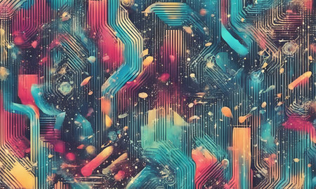 A dynamic digital landscape features bright, glowing shapes and lines, representing a complex network of data and technology in a vivid color palette.