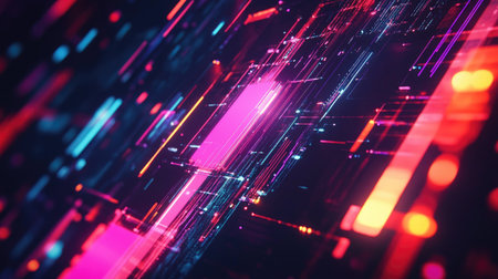 A striking arrangement of glowing lines and vivid colors creates an abstract digital landscape, conveying a sense of energy and movement in a futuristic setting.