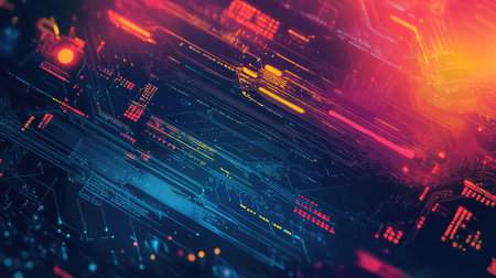 This abstract backdrop features a glowing digital circuit design that radiates vibrant colors against a dark background, evoking a sense of advanced technology and innovation.