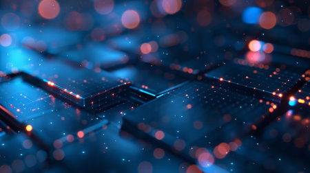 Futuristic technology scene. Intricately designed computer components in a high-tech setting, highlighted by vivid colors.