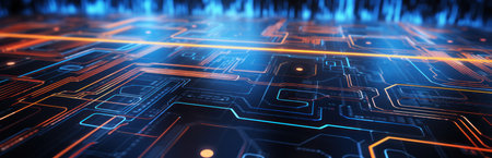 Futuristic circuit board close-up with vibrant blue and orange lines, creating a dynamic, tech-inspired abstract scene.