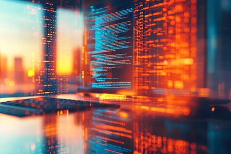 Double exposure of office space with digital code and holographic elements in vibrant gradient light