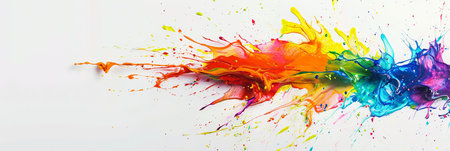 A dynamic burst of vibrant paint explodes across a white surface, capturing a moment frozen in time. The colors of the rainbow blend and swirl, creating intricate patterns and abstract shapes. Droplets and streaks of paint create a captivating visual tapestry.