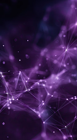 This abstract image features a complex network of interconnected dots and lines, presented in shades of purple. The composition creates a sense of depth and connection, set against a dark background. The digital art could be suitable for use in technology, data visualization, or design projects.