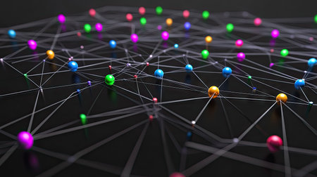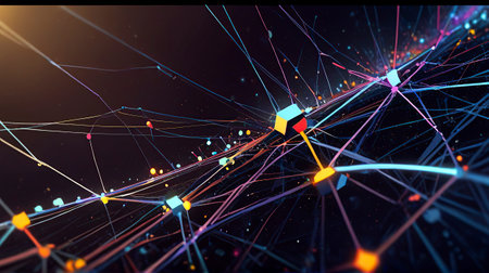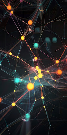 This vibrant and colorful abstract image showcases a network of connected nodes and lines, representing dynamic relationships and complexity in a visually stunning way. Perfect for digital art or scientific themes.