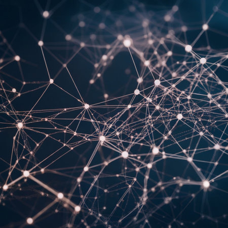 An abstract image showcases a network of interconnected nodes. The nodes have a warm, golden color, linked by lines that suggest connectivity. The composition is set against a dark background, and the lighting creates a sense of depth and dimension, suitable for technology or business applications.