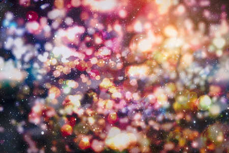 Abstract blurred glittering shine, blue and red. Blur light bokeh, night background. Christmas wallpaper decorations concept. New year holiday festive backdrop. Sparkle circle celebrations display.