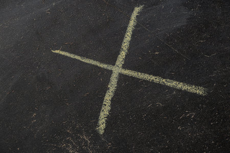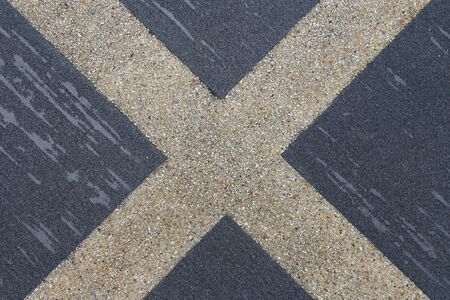 White paint line. X shape. Lines crossing. Grunge asphalt structure texture. Closeup granular noise background. Street grain pattern. Cracked paint stipe. Marked point.