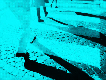Blurry city zebra crossing with walking pedestrians legs making long shadows. Duotone effect with texture