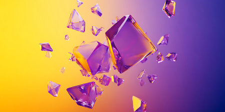 Vibrant purple crystals appear to float in mid-air, contrasting beautifully with a gradient background of yellow and purple.