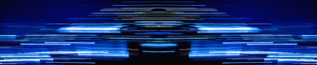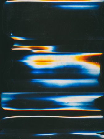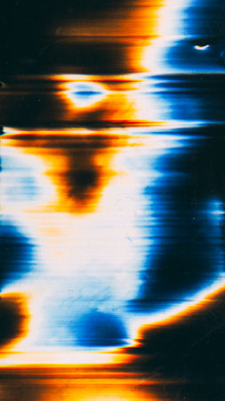 Glitch light. Overlay background. Distortion noise. Dark black display with glowing blue orange smearing vibration lines pattern.