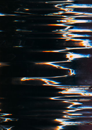 Light flare. Glitch overlay. Abstract background. Black scratched surface with glowing blue orange distortion lines pattern.