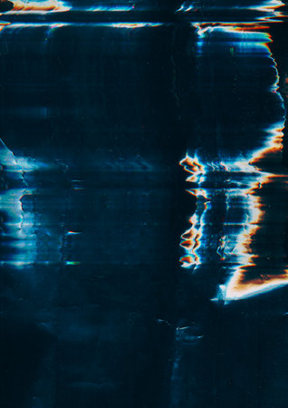Glitch overlay. Light flare design. Distortion noise. Dark background with neon blue orange blurred smearing cover pattern free space.