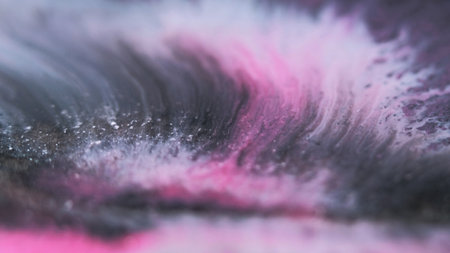 Paint splash. Wet blotch. Defocused pink black white color shiny grain texture acrylic dye fluid mix wave abstract art background.