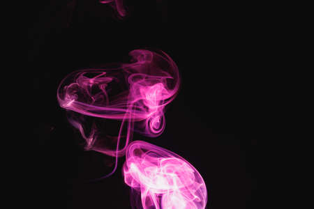 Purple smoke on a black background. Colored smoke. Incense stick smoke illuminated by purple light.