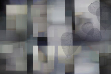 Abstract geometric background with rectangles of gray, yellow shades and gray leaves