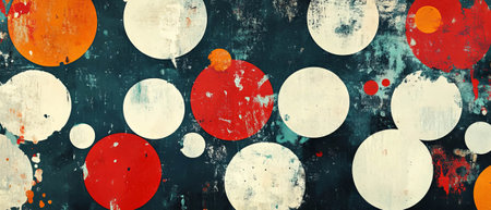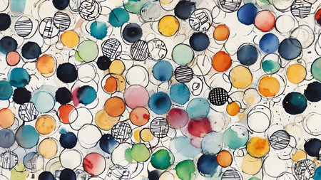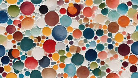 Brightly colored abstract artwork showcases a multitude of circles in various sizes and hues, creating a lively and dynamic composition on a textured background.