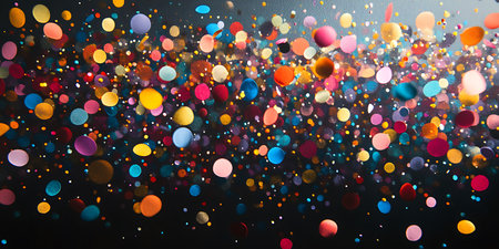 Colorful confetti particles floating in a dark background with shiny gold accents