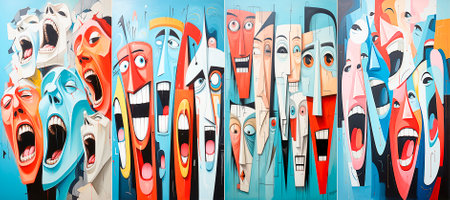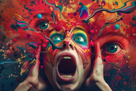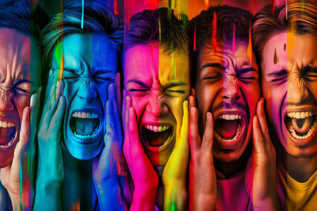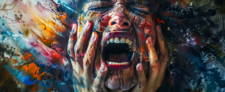 Emotional abstract artwork depicting a person screaming with vibrant, chaotic colors and a textured background