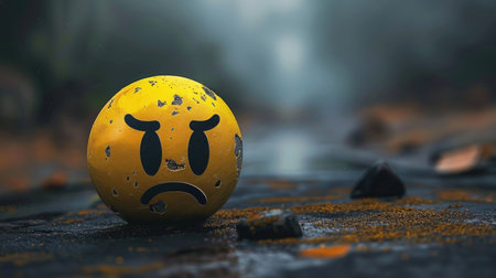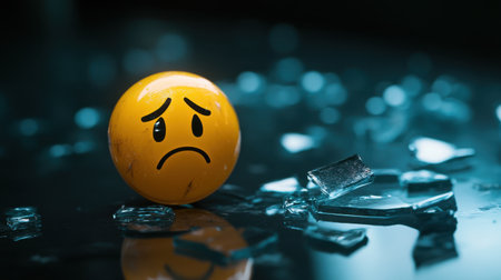 A sad emoticon emoji sits against a backdrop of shattered black glass, symbolizing emotional fragility and brokenness.