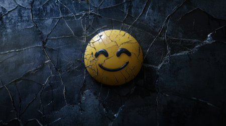 Sad face emoji on a cracked black glass background, representing the theme of emotional fractures and heartbreak.