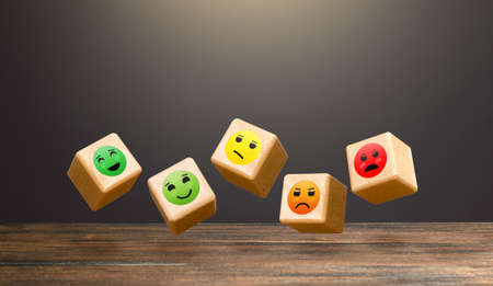 Flying blocks with faces of moods from joy to anger. Conducting a survey. Rating. Approval, indifference, or disagreement. Clients' mood, public opinion. Popularity. Assessment of people's reaction.