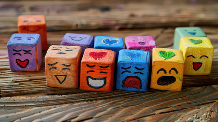Vibrant wooden blocks display a range of emotions, perfect for educational themes focusing on child development and emotional intelligence.