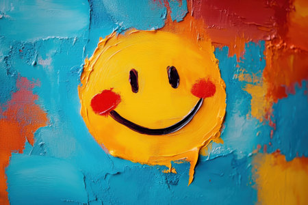 A joyful smiley face fills the canvas with bright yellow and red accents, surrounded by a blend of vivid blue and orange paint. This piece radiates happiness and positivity.