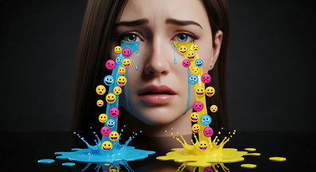 Woman crying colorful emoji tears splashing on dark surface