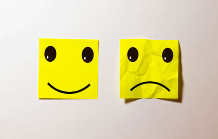 two notes stuck on message cork board with smiley and sad cartoon face expression in happiness versus depression and smile against adversity concept