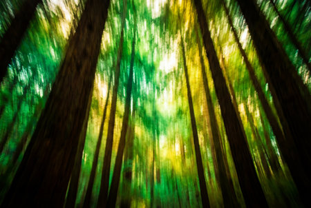 Creative abstract view of tall forest trees blurred by vertical camera movement showing streaks of green leaves and sunlight filtering through the canopy from a low angle perspective.