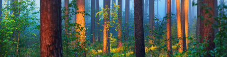 background blur Natural wooden front view. Spring forest concept. Sunrise in woodland spring background. backlight Design transformation of space. peaceful daylight wallpaper. Horizontal banner.