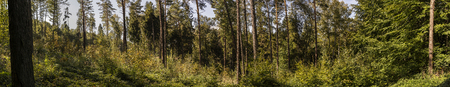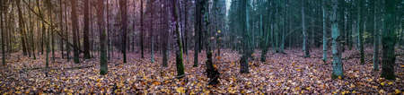 Dark scary night autumn forest wide horizontal format banner. Divine magnificent dense woodland panoramic web banner.