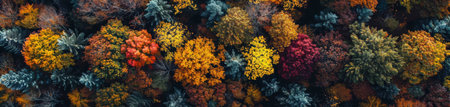 A forest with many trees in different colors of leaves. The leaves are red, yellow, and orange