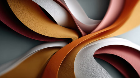 This captivating abstract artwork showcases swirling layers of colored paper in warm tones, creating a dynamic composition with textured surfaces and soft lighting.