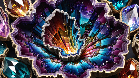 Vibrant crystals shine with kaleidoscopic beauty, illuminating the power of nature's treasures