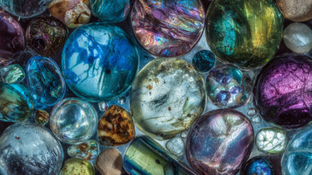 This captivating close-up showcases an assortment of colorful sparkling gems, reflecting a myriad of light and vibrant hues, creating an alluring visual impact.