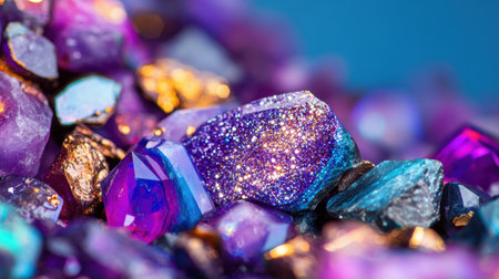 A stunning close-up of colorful gemstones scattered on a surface, surrounded by sparkling dust and light, creating a mesmerizing and artistic background.