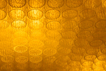 Corrugated glass with backlight. Beautiful light refraction in red, brown, yellow, orange and black colors. Abstract background for self-adhesive films. Ribbed glass surface.