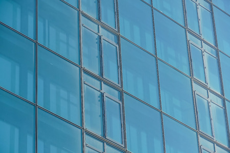 Blue glass windows wall background of modern office building exterior, contemporary architecture concept