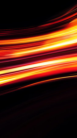 Striking abstract image showcasing dynamic flowing light streaks in vibrant hues of golden yellow and fiery red against a stark black backdrop. Energy, movement, and glowing brilliance.