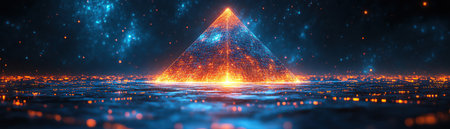 Futuristic pyramid glowing with blue and orange lights, digital matrix background